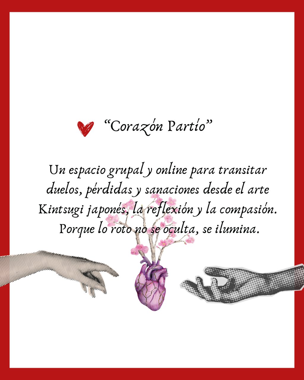 Este taller es una invitación a mirar tus cicatrices con amor, reconciliarte con lo vivido y transformar el dolor en belleza y fuerza vital.